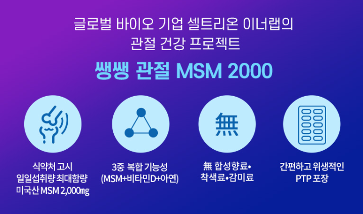 MSM은 자연 유황 성분으로, 관절염과 같은 염증성 질환을 예방하는 데 탁월한 효과가 있습니다. MSM은 염증을 줄이고, 관절의 통증을 완화시키며, 관절의 기능을 개선하는 데 도움을 줍니다. 또한 MSM은 피부와 모발 건강에도 좋다고 알려져 있어, 다방면에서 건강을 챙길 수 있는 영양제입니다.