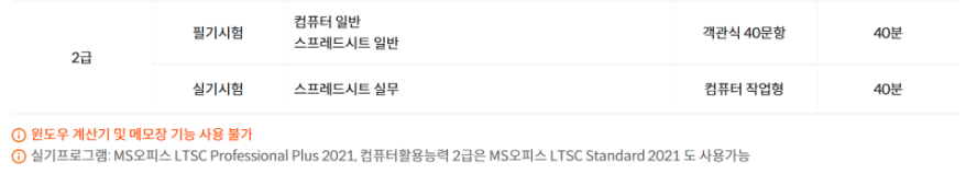 - 필기 시험: 객관식 40문항 (1과목: 컴퓨터 일반 / 2과목: 스프레드시트 일반)