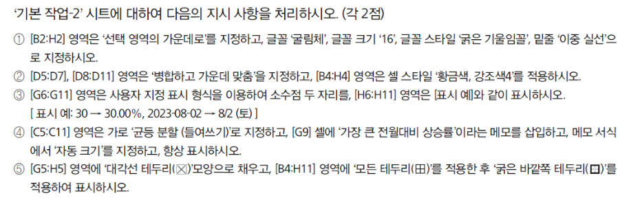 - 실기 시험: 엑셀을 활용한 실습형 문제 (데이터 입력, 함수 활용, 차트 작성 등)
