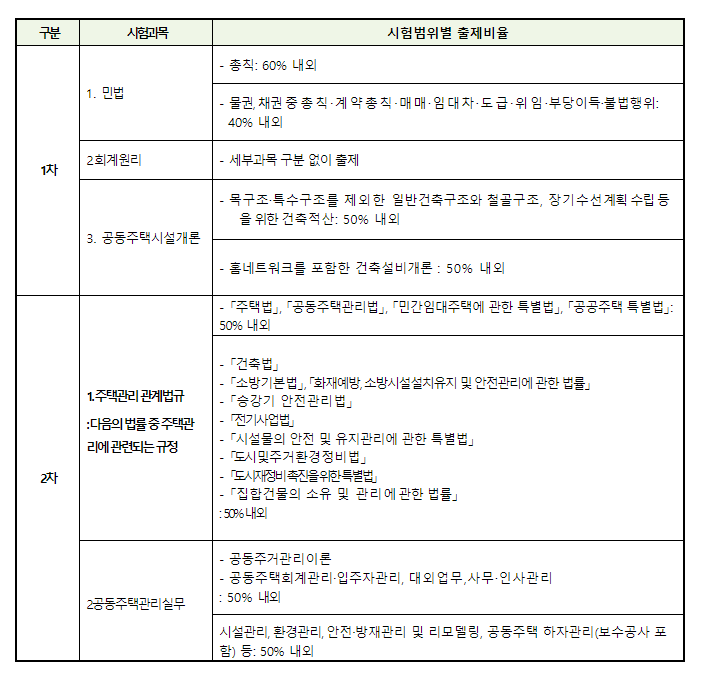 주택관리사 1차 시험은 법률과 관리의 기초 지식을 평가하고, 2차 시험은 실무와 관련된 보다 심화된 내용을 다룹니다. 특히 2차 시험에는 주관식 문항이 있기 때문에 다른 국가 자격 시험과는 조금 다른 준비가 필요합니다.