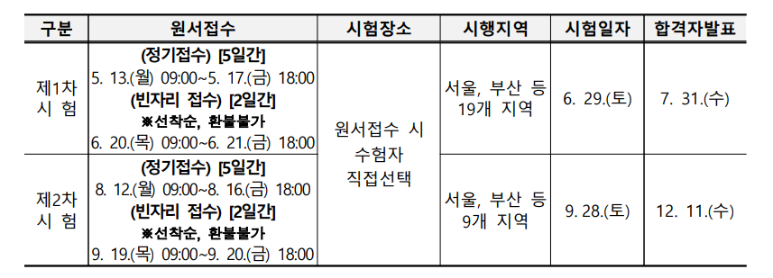 올해는 이미 1차시험이 끝이 났으며, 2차 시험이 이번주 토요일에 있습니다. 준비하고 계신분들 모두 좋은 성적 거두시면 좋겠습니다. 매년 시험 일정은 비슷하니 내년도 2025년 시험을 준비하고 계신 분들도 일정을 미리 파악하시면 되겠습니다.